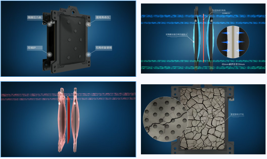 超高压橡胶多膜低温干化工艺技术可将市政污泥含水率从98%直接处理至20%左右、工艺包含深度脱水减量无害化、污泥热值提升工艺,系统集成多项核心技术,包括:污泥调质工艺、智能高压进料脱水、超高压双隔膜深度压榨脱水、磁热常温干化脱水、滤布自动行走卸泥、滤布自动清洗、除臭装置、无人值守、远程控制系统等先进技术,集高压过滤、高压双隔膜压榨、磁热低温干化为一体智能型深度脱水干化一体压滤机。